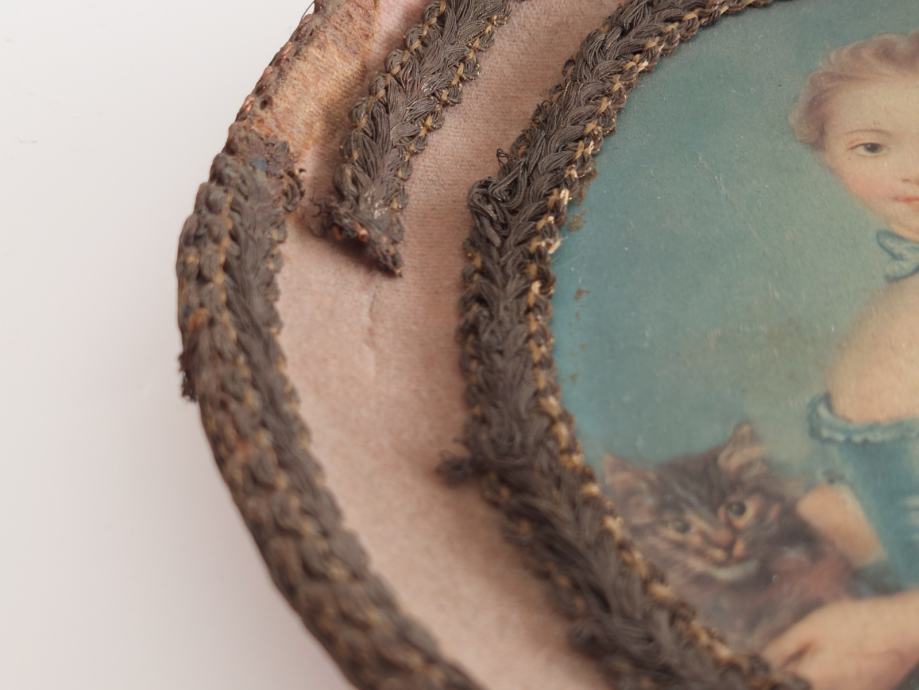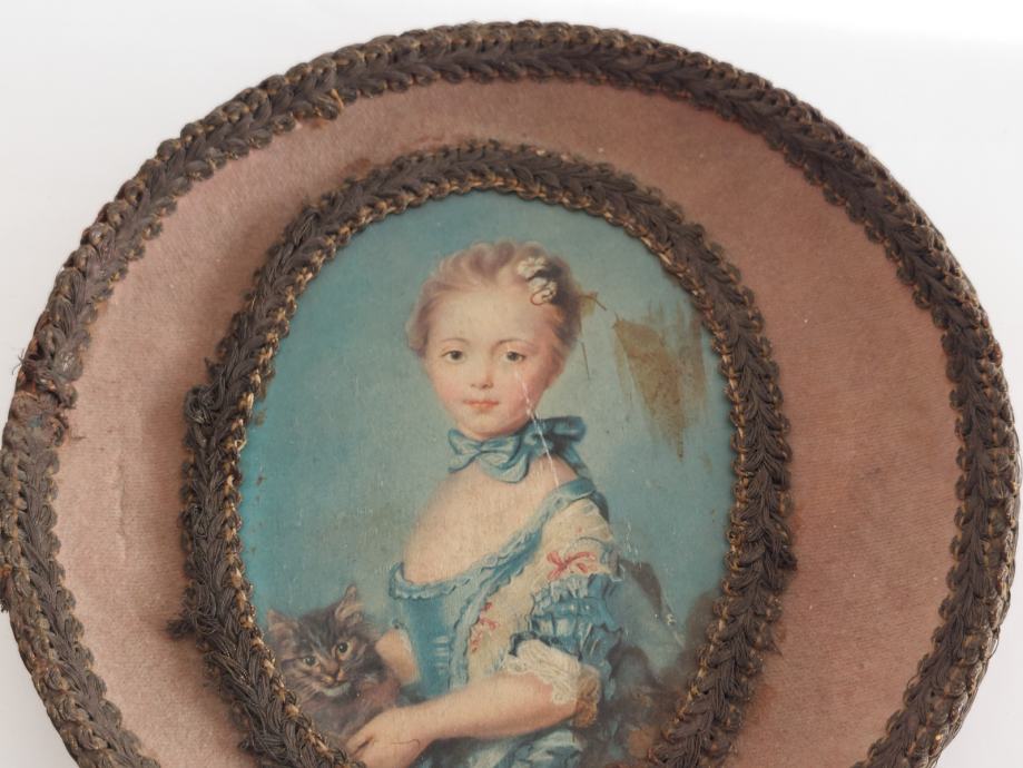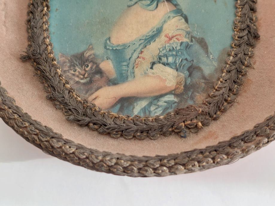 STARA OVALNA SLIKA Z REDKIM OKVIRJEM V OBLIKI KROŽNIKA,DEKLICA Z MAČKO