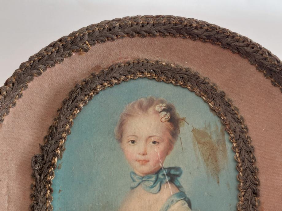 Prodam staro ovalno sliko z redkim okvirjem v obliki krožnika.Spredaj in zadaj je mehko fino blago (fini žamet,pliš?).