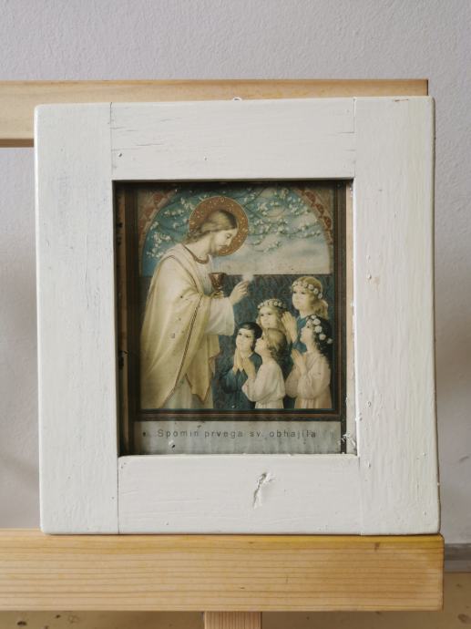 Stara slika v okvirju z nabožno tematiko (Spomin prvega sv. obhajila)