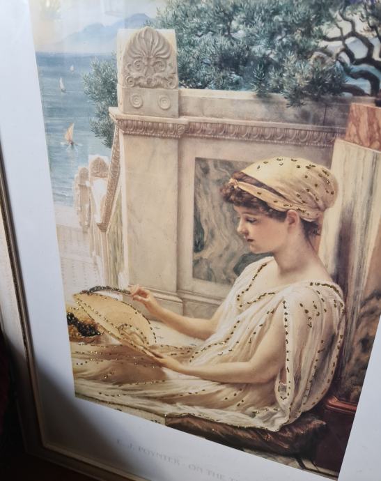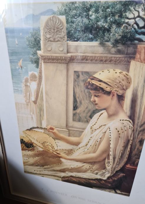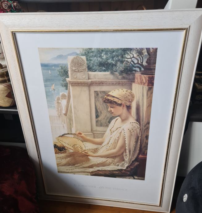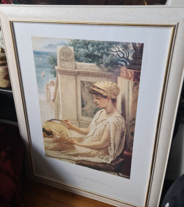 Prodam vecjo okrasno sliko z belim.lesenim okvirjem, print. Dekle ima v obleki blescice. Zelo lepo ohranjena, kot nova.