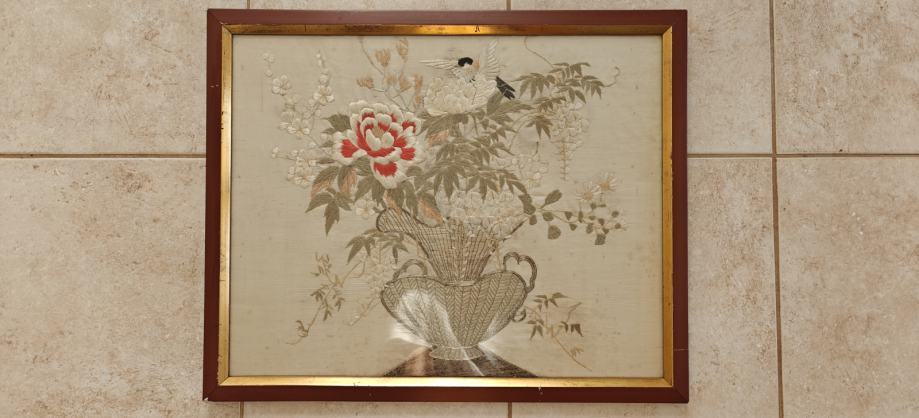 Naprodaj vezena dekorativna slika, uokvirjena, tihožitje, velikost cca 40x30cm.