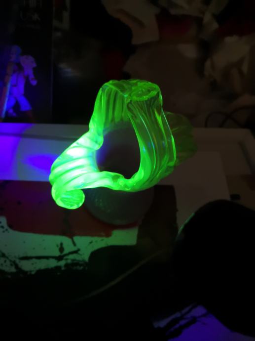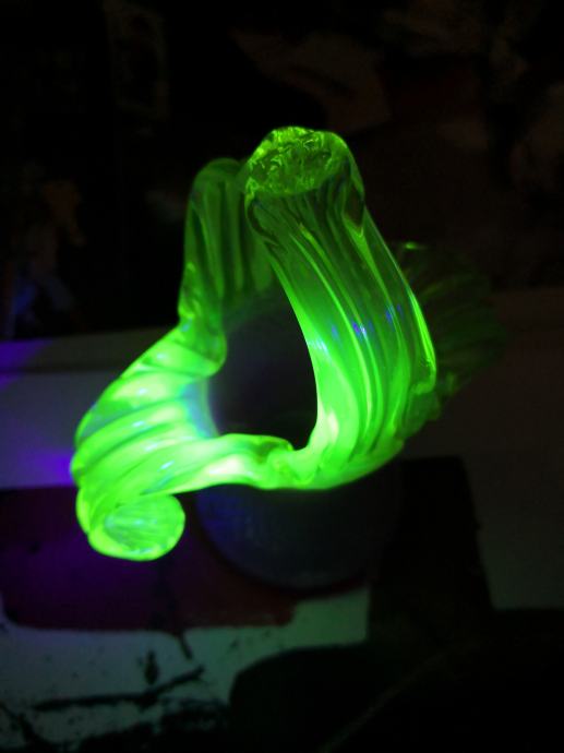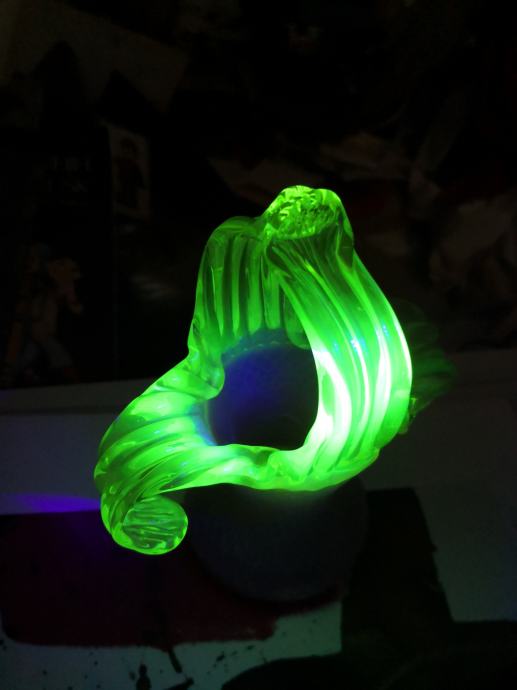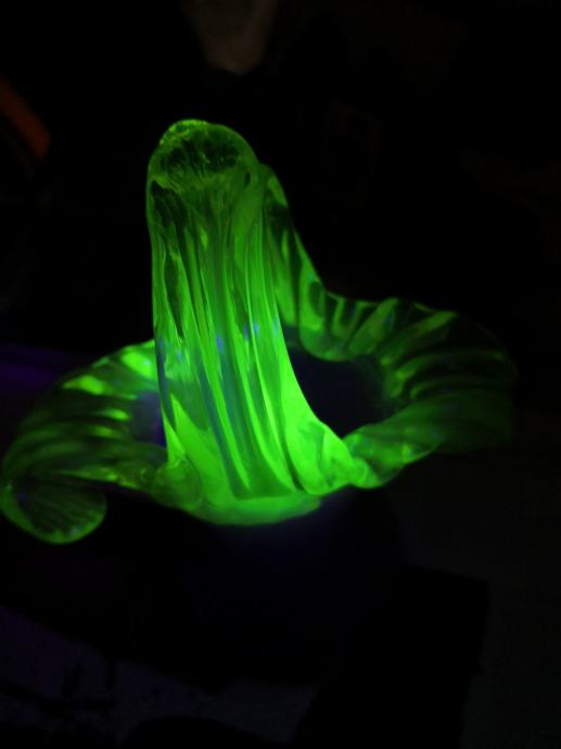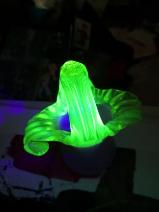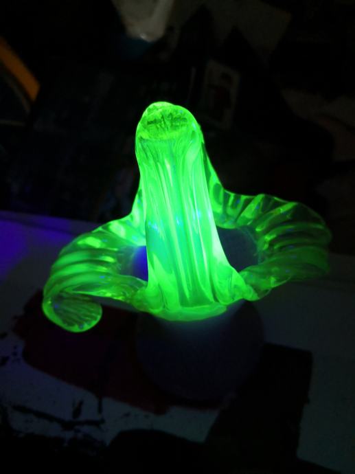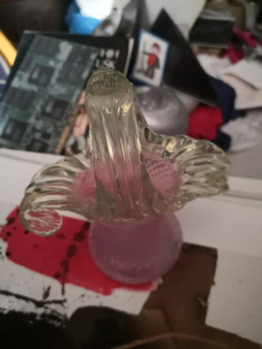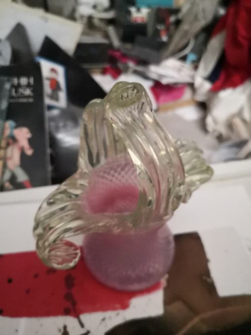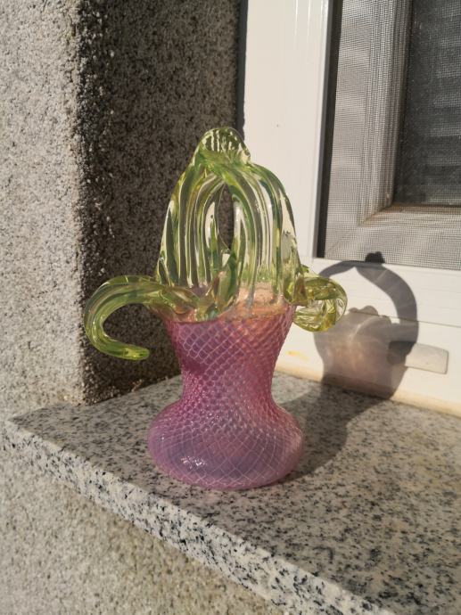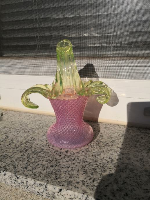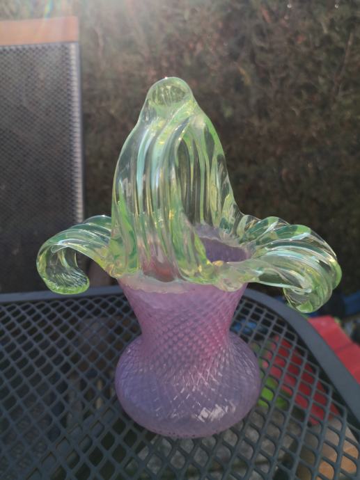 Prodaja se starinska steklena uranova vaza, za zbiratelje, zbirateljski kos, REDKOST!!, Antique vase, Antique 1905 Kralik Pink & Green Glass Floriform Basket, 6 1/2", Diamond Pattern Pink , Uranium Glass Handle Rolled Leaves, Czech Art Glass,,,,,