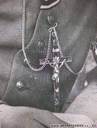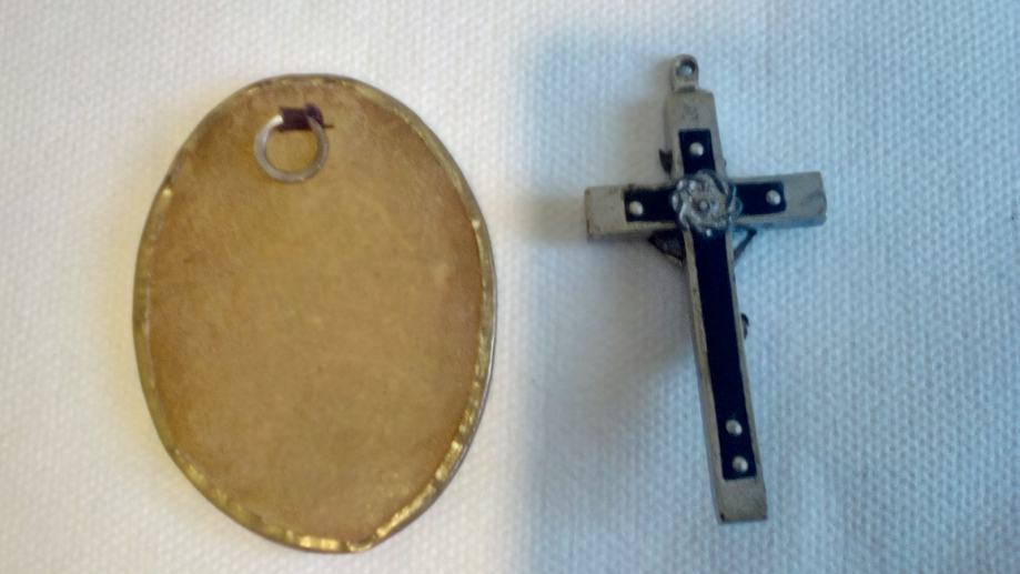 Prodam nabožne predmete: sliko z Jezusom Kristusom - višina 67 mm, širina 50 mm a obesek križ z Jezusom K. - v. 67 mm, š. 33 mm. Križ je izdelan iz bele kovine, polnjene s črnim lesom (na sliki je križ na nemškem vojaškem kaplanu, I. svetova vojna). 20 + 30 e.