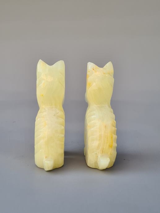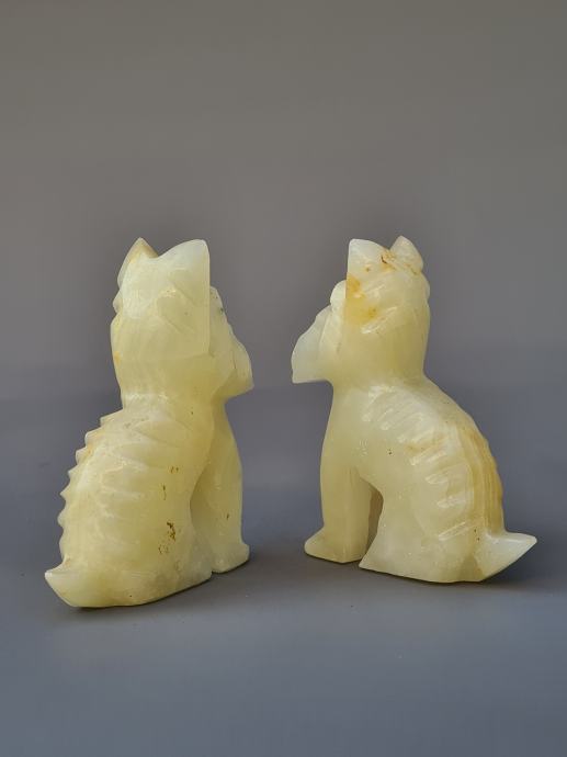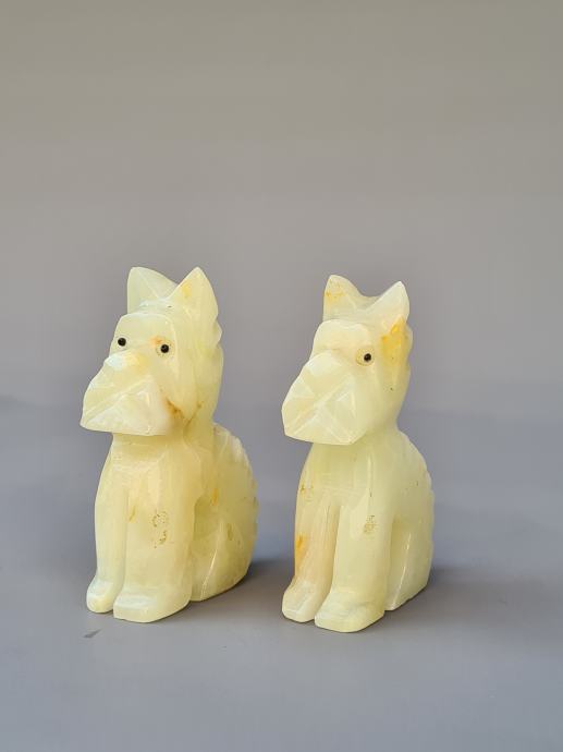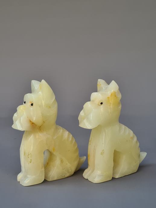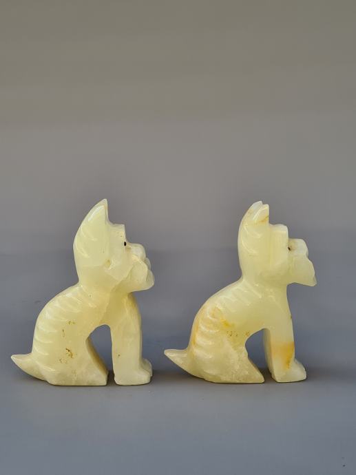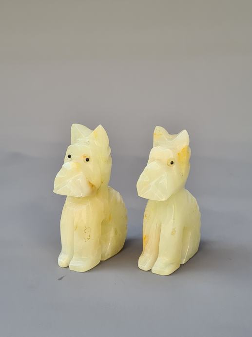 Komplet lepo ohranjenih kamnitih psov. Psa sta izrezljana iz svetlo rumenega, bež kamna (kalcit) in predstavljata pasmo škotski terier ali schnauzer in merita 9 x 7 x 3 cm.
