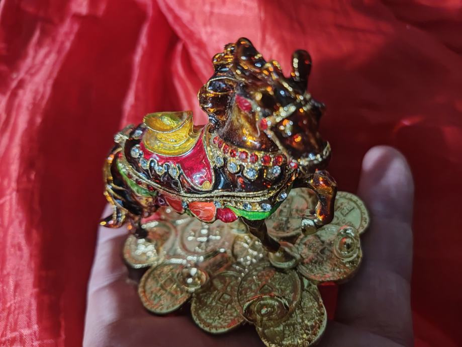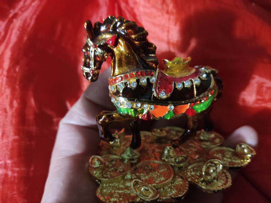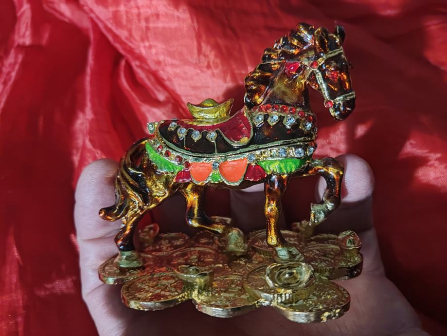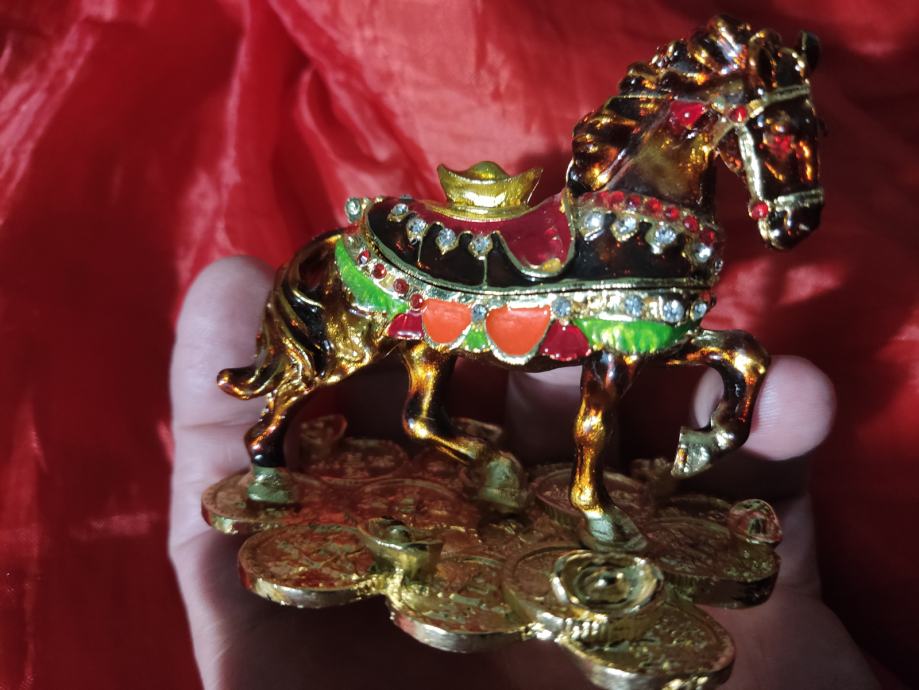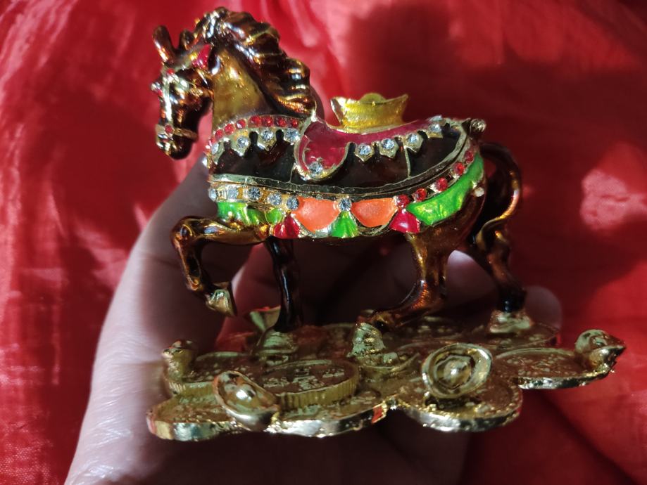 Prodam kovinski kip konja z vgrajenimi imitacijami lesketajočih diamantov in rubinov. Diamanti in rubini - cirkoni so sintetični/ni pravi diamant! Umetniško delo.
