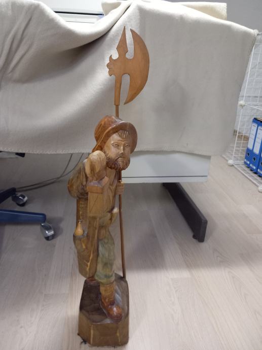 Ročno izrezljan leseni kip, pobarvan in polakiran, višina 56 cm oz. s sulico višina 72 cm, lepo ohranjen in brez napak. Unikat. Lepo darilo za ljubitelja lesenih kipcev in lesenih okraskov. Možna dostava Ljubljana, Celje ali obala.