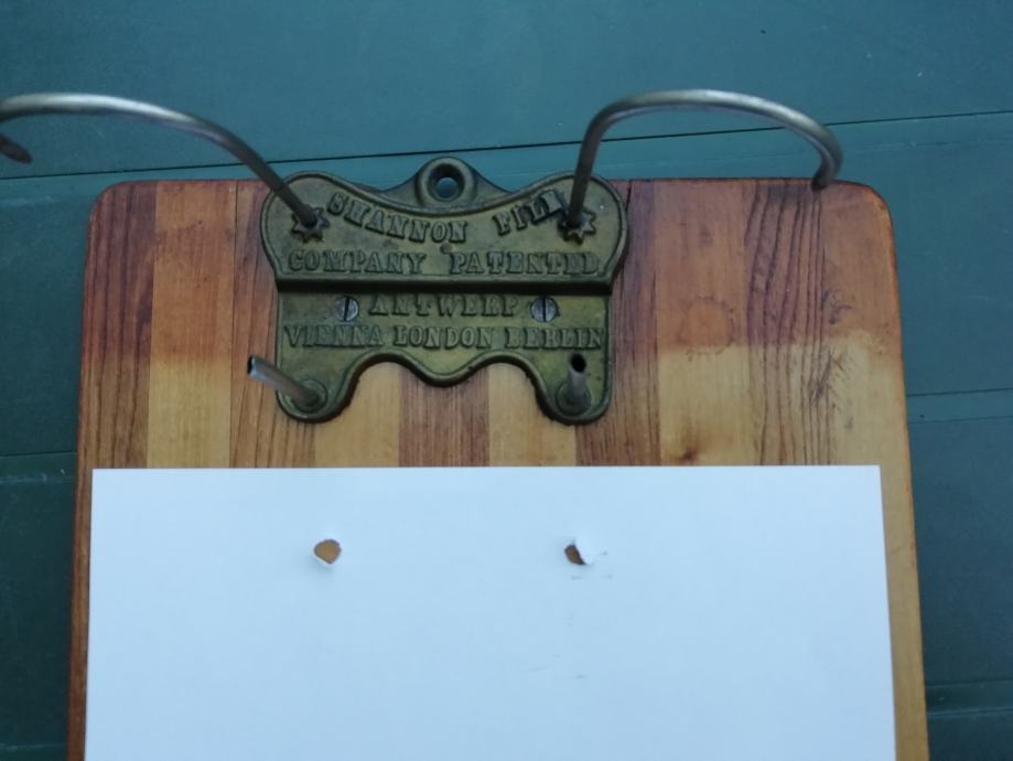 Starinska lesena podloga za pisanje (v trgovinah?) ali za fascikel. Barva starega lesa. Papir potisnemo na navpični priostreni paličici, ki ga preluknjata. Če podlogo obrnemo, dobimo poševno podlago za papir (na zadnji fotografiji).