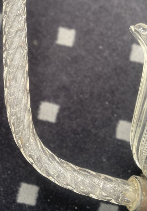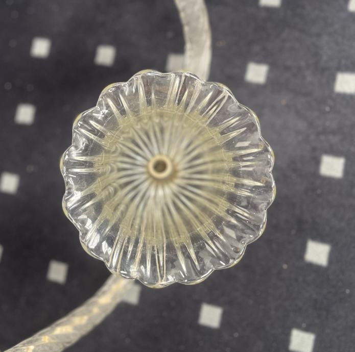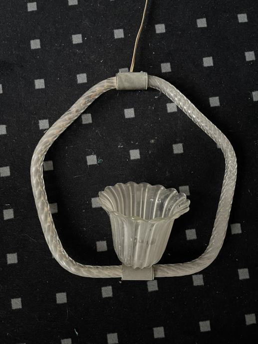 Italija, sredina 20. stoletja, polkrožni senčnik iz delno zvitega prozornega stekla , premer približno 45 cm, skupna višina približno 45 cm. sledi starosti in obrabe, praske in odrgnine, potrebno urediti električno inštalacijo.