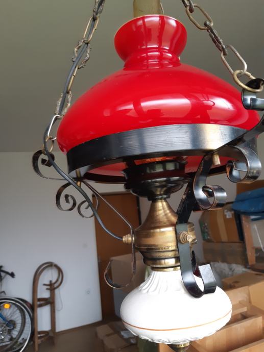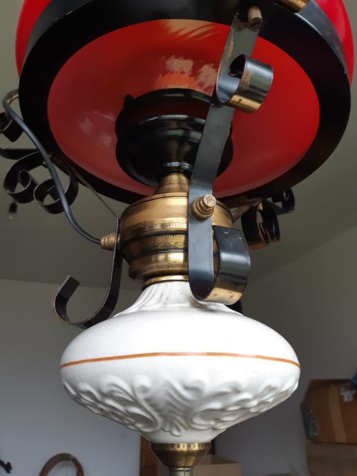 Prekrasen lestenec z redkim širmom/sencilom v rdeci barvi (ročno pihano steklo) premera 23 cm. Ima porcelanasto dno.