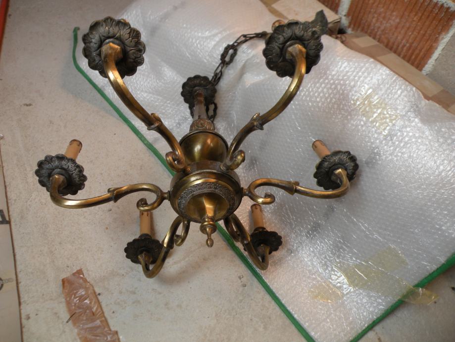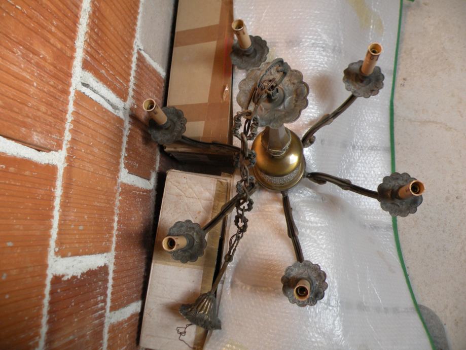 Star masiven medeninast lestenec potreben čiščenja ter zamenjave električne inštalacije. Teža 5 kg , višina 1,22 metra katero se lahko prilagodi (skrajša) Zaradi lomljivosti samo osebni prevzem.