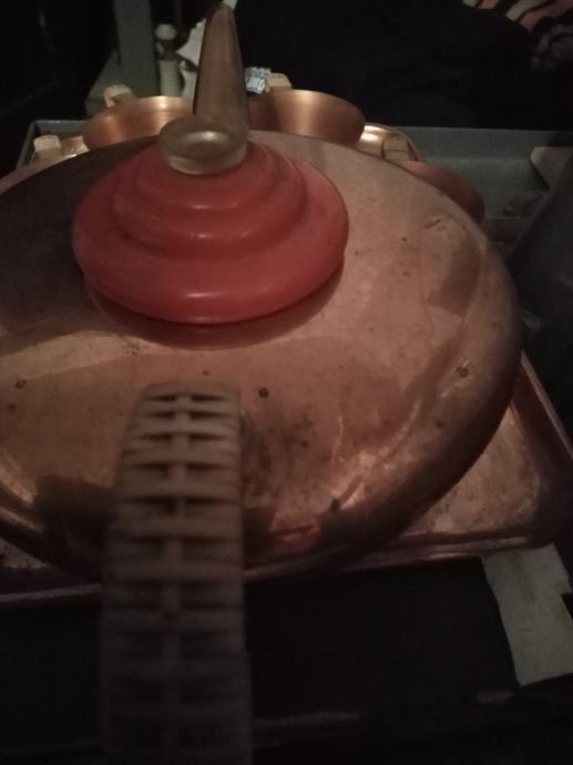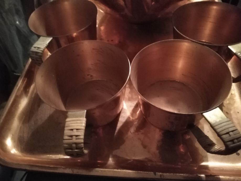 Medeninasti čajnik iz medenine, ta poslikan, z pladnjem.
