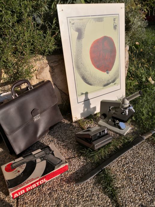 prodaja se lot starin, bajoneti,bajonet,fotoaparat polaroid,aktovka,grafika,mikroskop,pištola,