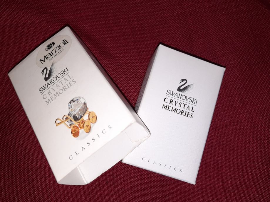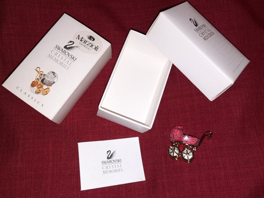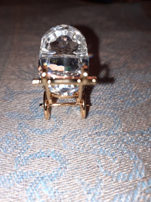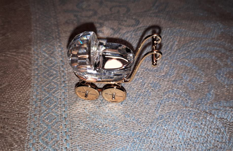 Prodam miniaturni kristalni voziček znamke Swarovski. Dolžina 3,8 cm. Kristal je brušen v 247 fasetah. Ročaj in koleščka so v 18-karatnem zlatu. Takih vozičkov v omejeni seriji Christal Memories ne izdelujejo več (zadnji primerki leta 2005). Nepoškodovan in neokrušen. V originalni in nepoškodovani škatlici, z mini knjižico. Primeren za darilo ob rojstvu ali krstu.
