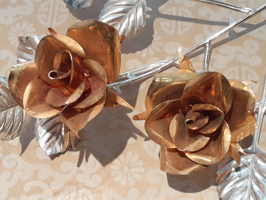 Ornamentalni obtežilnik za papir iz posrebrenih in pozlačenih vrtnic iz 70. let 20. stoletja. 13x17x5cm.