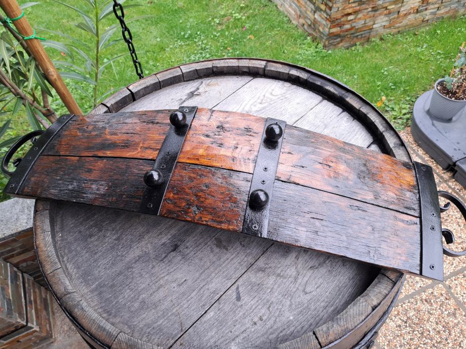 Pladenj narejen iz vinskih dog, dolžine 90 cm z ročaji,širina 23 cm, povoskan.