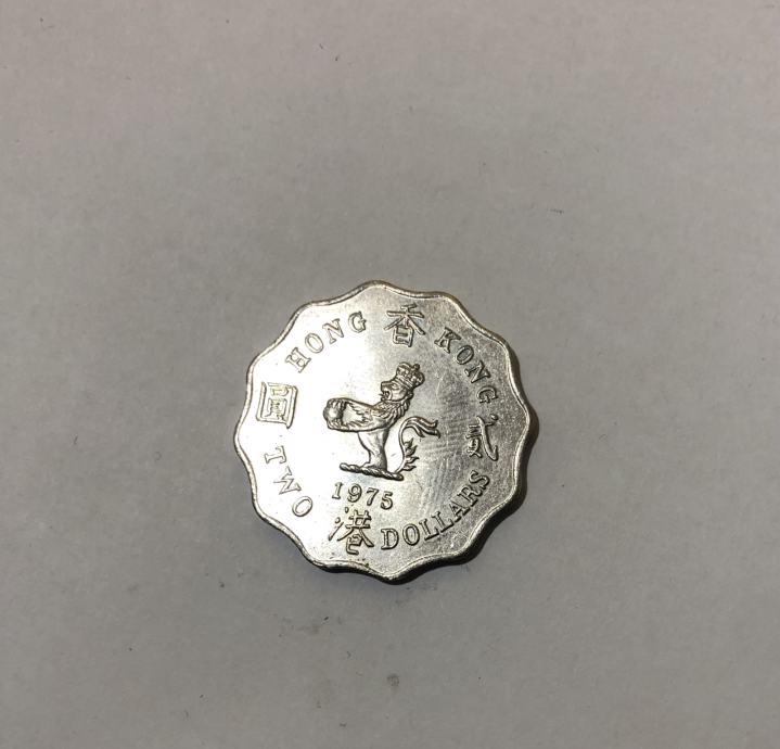 Hongkonški kovanec za 2 dolarja iz leta 1975 z nazobčanim robom, kraljica Elizabeta ll.