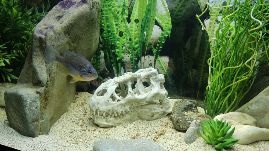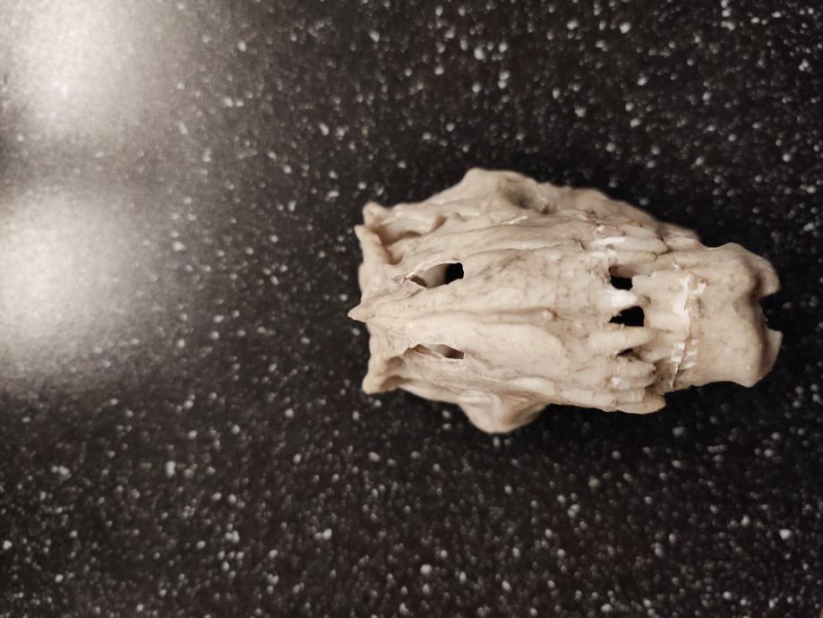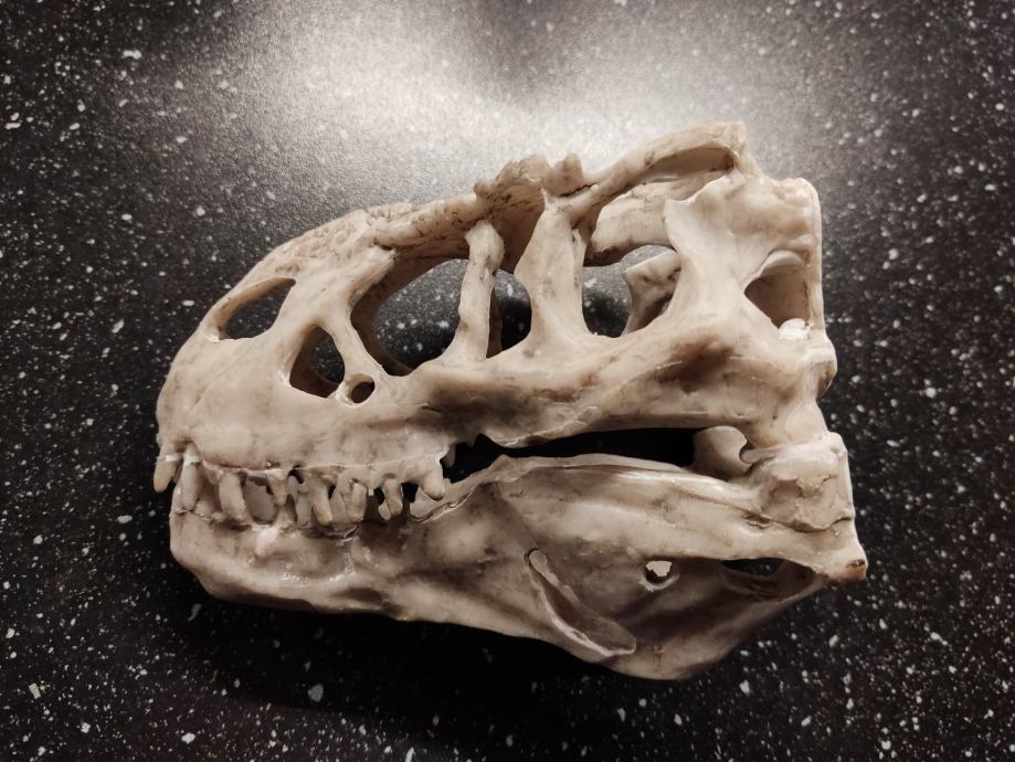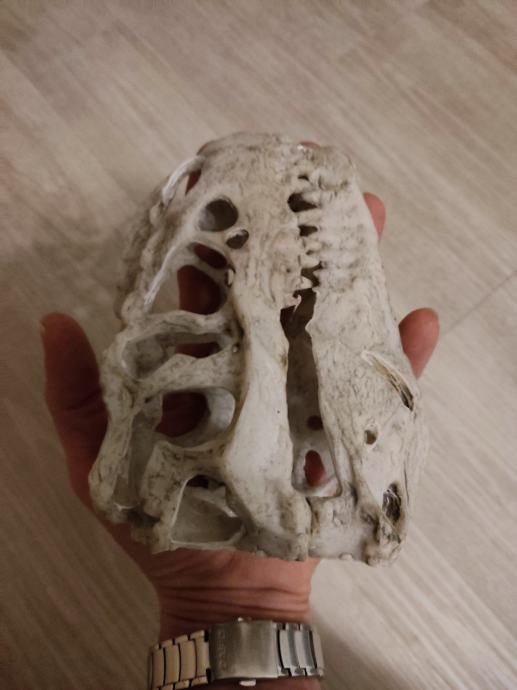 Replika lobanje tiranozavra, ulita iz umetne smole. Dimenzije 14x11x8cm. Poglejte tudi moje druge oglase, prodajam tudi repliko velociraptorjeve lobanje, ki je bolj detajlna.