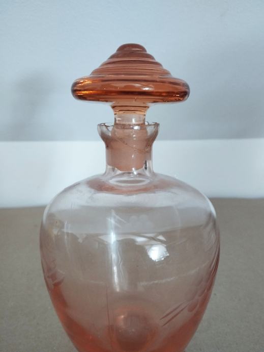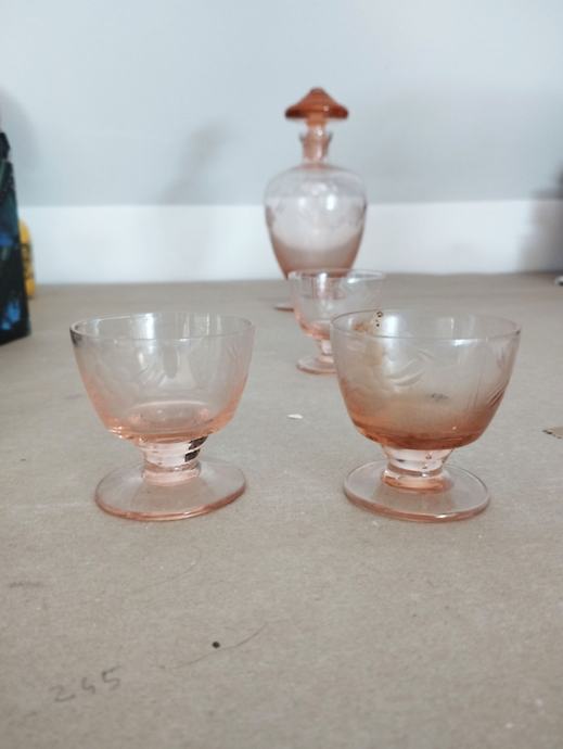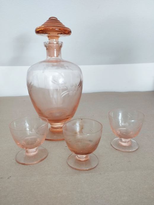Prodam komplet treh kozarčkov in steklenice iz rožantega stekla. Steklenica ima steklen čep, je pa nekoliko poškodovana na grlu. Samo osebni prevzem. Višina steklenice 21 cm, premer 11 cm, kozarčki 6x6 cm.