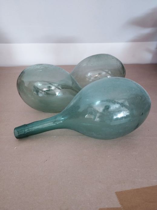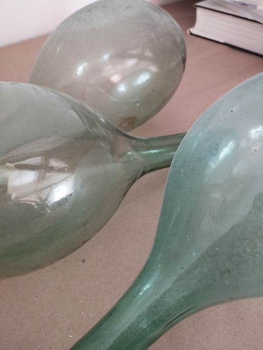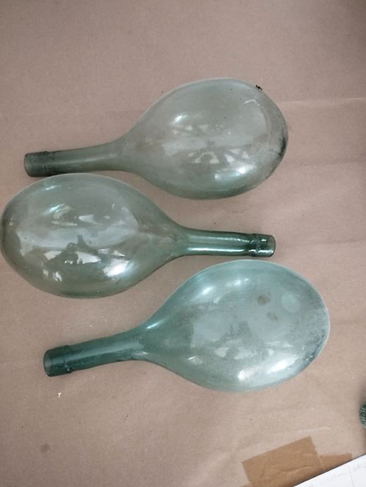 Tri stare steklenice za žganje, namenjene za opletanje. Zanimive oblike. Samo v kompletu. Višina steklenica cca 33 cm in premer 15 cm.