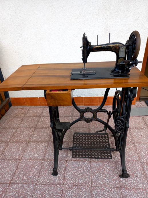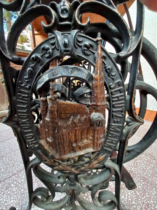 Klasični šivalni stroj,okrasni stranici z zvonikom Štefanove cerkve