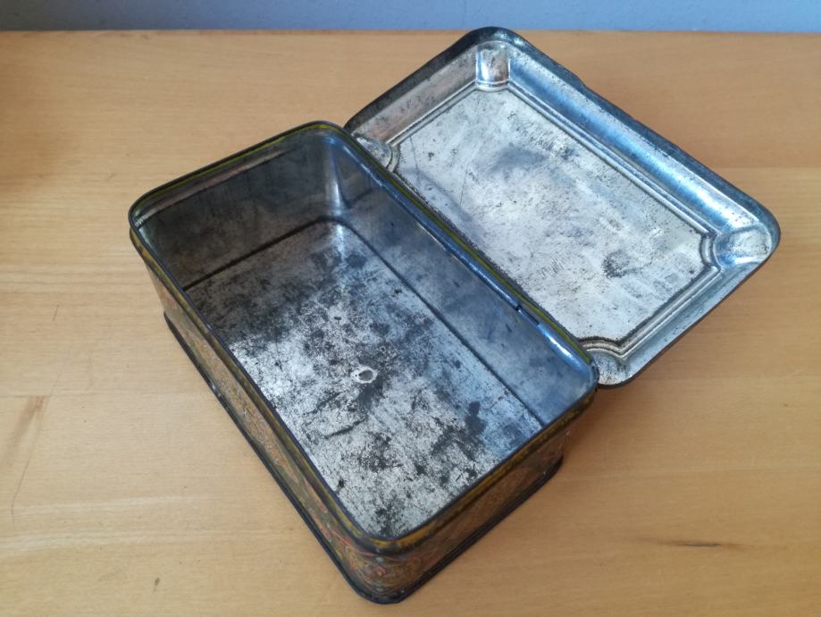 Plehnata škatlica Saturnus Ljubljana, šestdeseta leta, orientalski motiv. Dimenzije 6x8x14cm