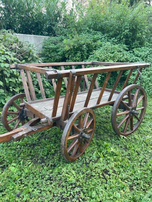 Čudovit star lesen voziček, ročno izdelan iz masivnega lesa, s kovaško izdelanimi železnimi kolesi.
