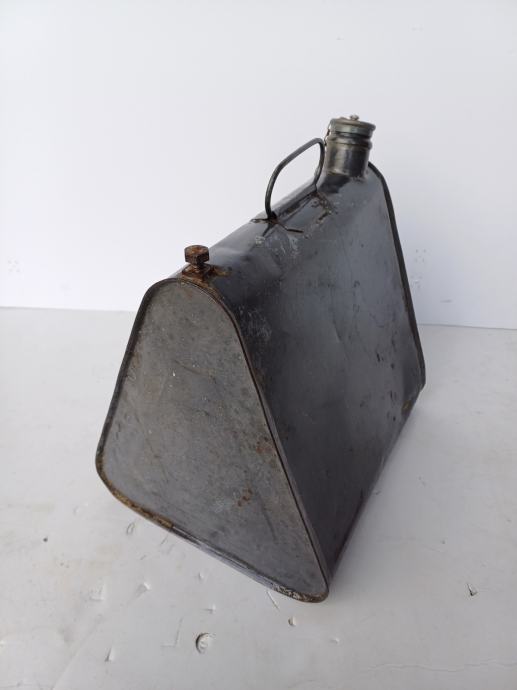 Stara pocinkana srednje velika trikotna pločevinasta posoda za bencin tudi oljna posoda - kanister za olje - industrijska oprema ( oldtimer avto - moto ) rezervoar ni nikjer prerjaven - notranjost lepa.