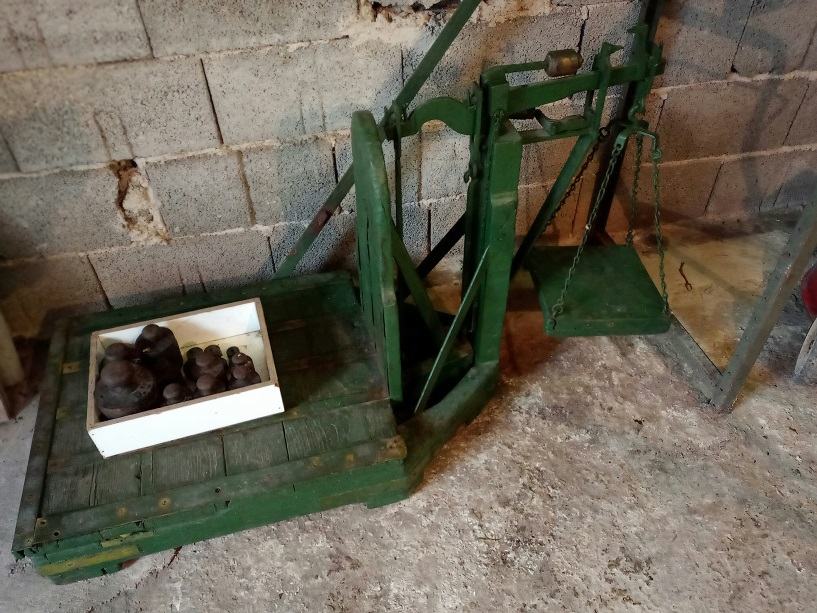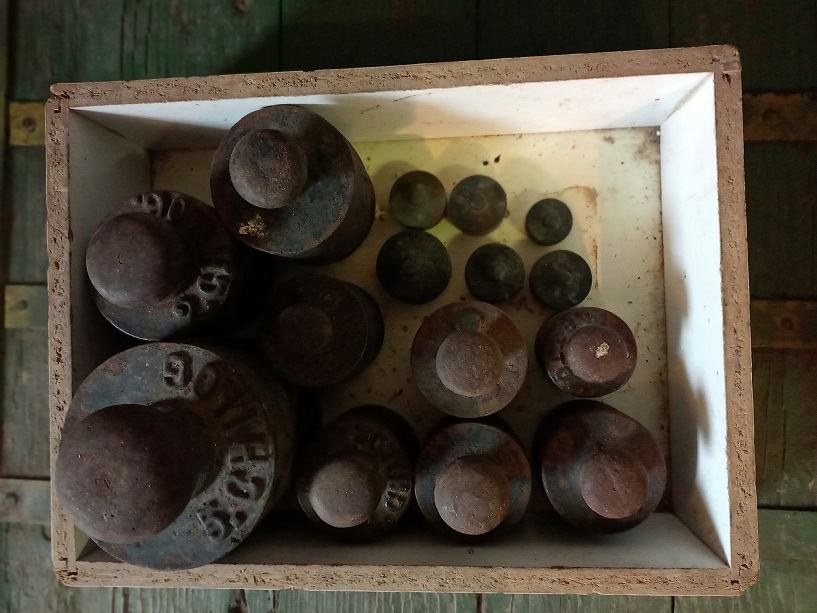 Stara tehtnica vaga skupaj z utežmi.