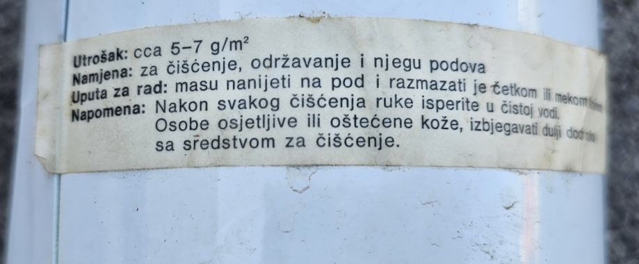 Namjena: za čišćenje, održavanje i njegu podova Uputa za rad: masu nanijeti na pod i razmazati je četkom ili mekom Uppomena: Nakon svakog čišćenja ruke isperite u čistoj vodi Osobe osjetljive ili oštećene kože, izbjegavati dulji dodh ne sa sredstvom za čišćenje