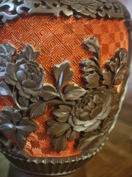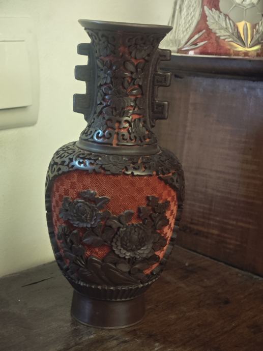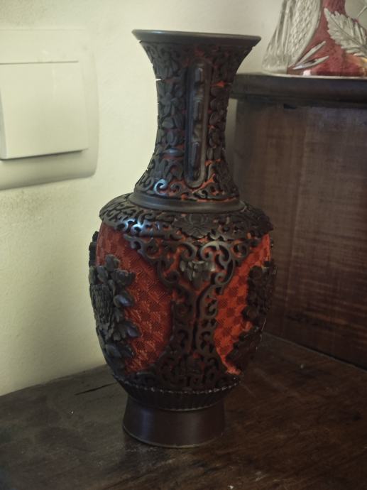 Starinska kitajska črno-rdeča vaza s kositrnim lakom. Modri emajl. Ročno izrezljana. Višina 18 cm. Cena: 180 evrov.