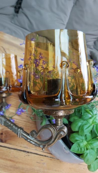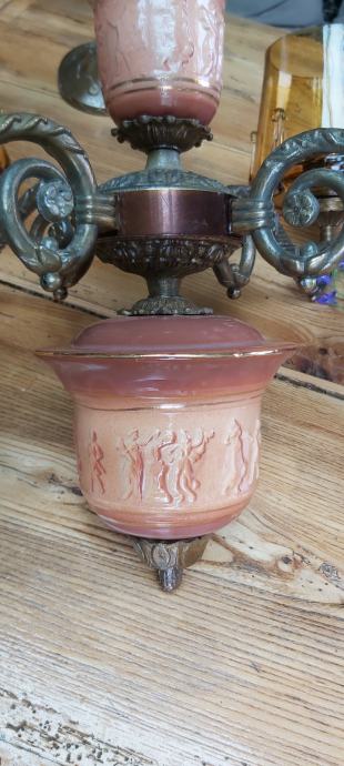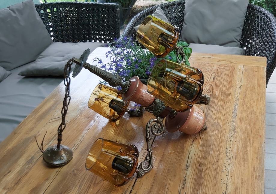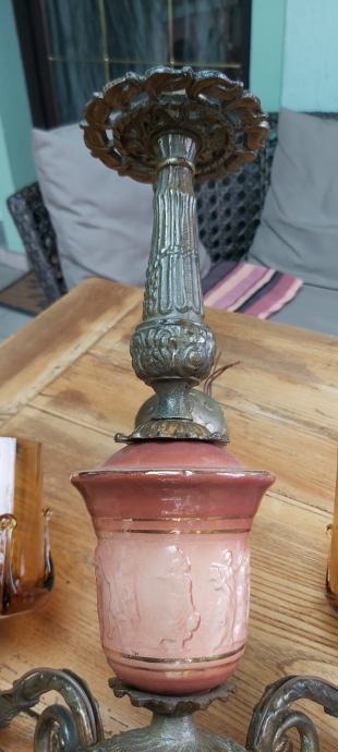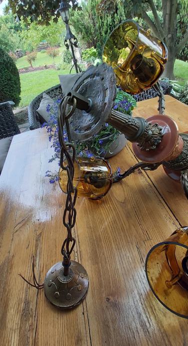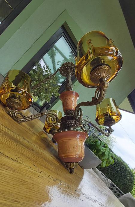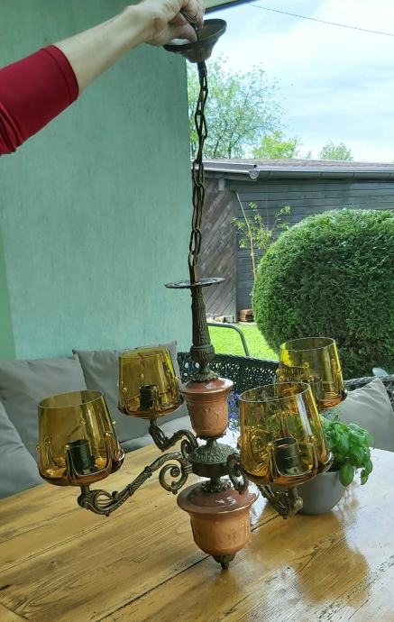 Večja stropna meščanska luč iz petdesetih let 20. stoletja - vintage v brezhibnem stanju, ogrodje masivno iz medenine, bučke zelo dekorativne iz pihanega stekla v rumenem odtenku, glazirani keramični vmesni okraski, primerna za večje prostore, stara meščanska stanovanja, ateljeje, gostinske lokale in podobno.