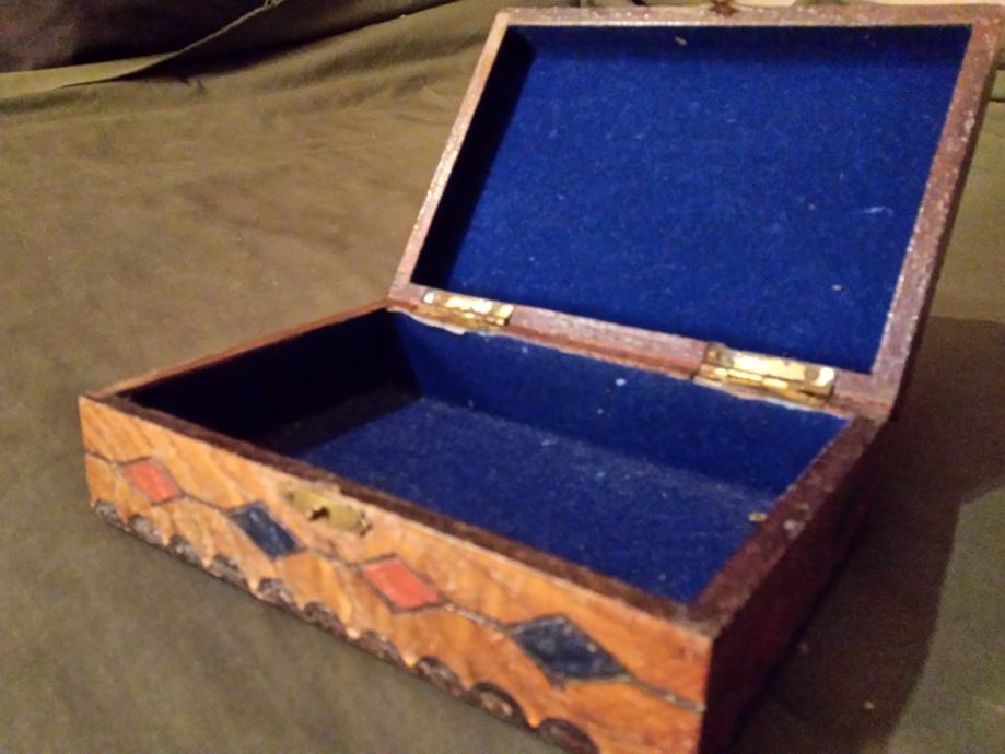 Prodam zelo staro leseno šatuljo. Żgano v les, ročno delo, unikat. V: 5 cm, š: 17 cm, g: 5 cm
