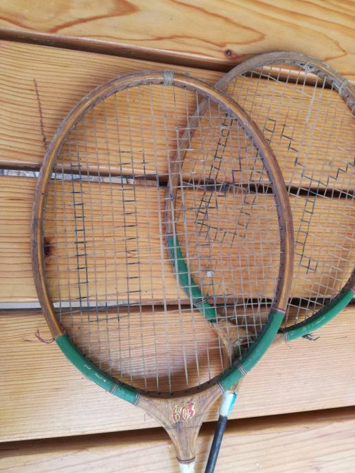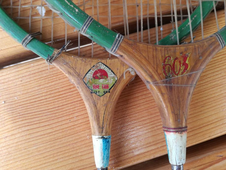 Par vintage retro loparjev za badminton, verjetno iz sedemdesetih let, leseni okvirji.