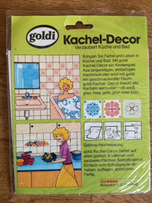 Nalepke za kuhinjske ploščice, original zapakirane, iz sedemdesetih let. V enem kompletu je 5 nalepk 15x15cm. Na voljo več kompletov. En komplet 5€.