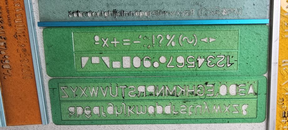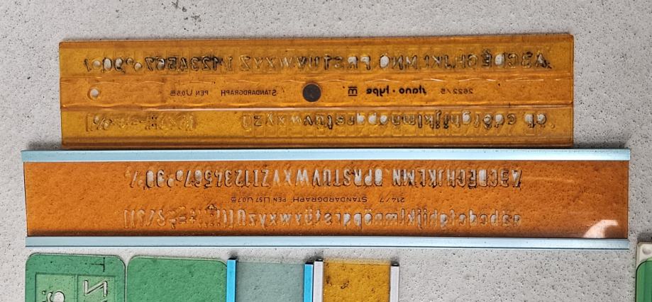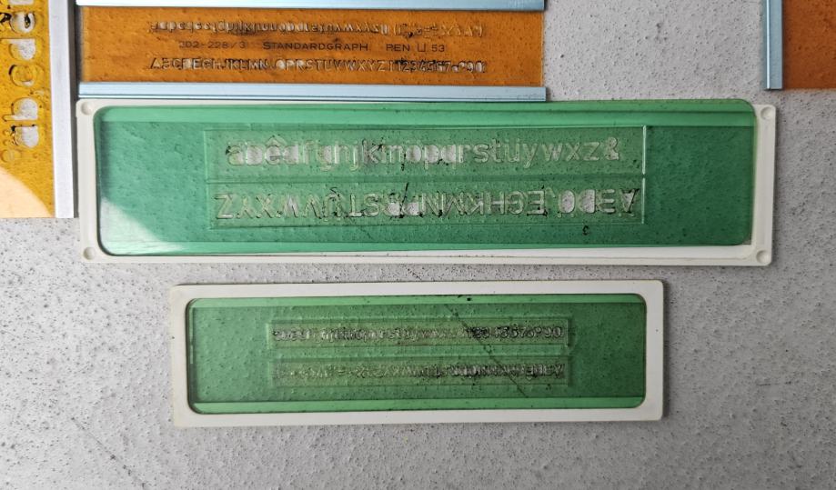 Vintage šablone Tecnostyl Normografo za črtanje velikih in malih črk.