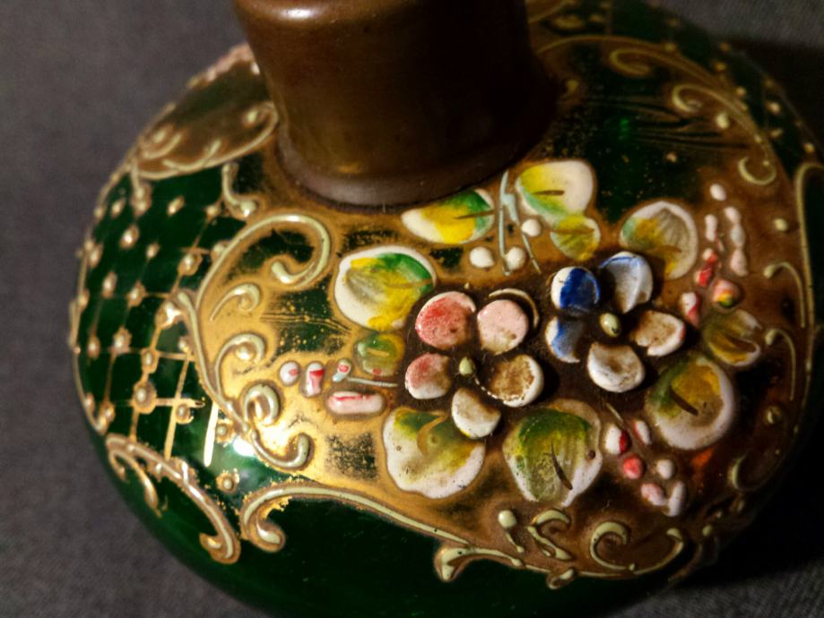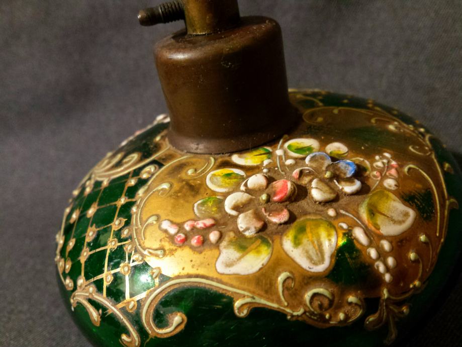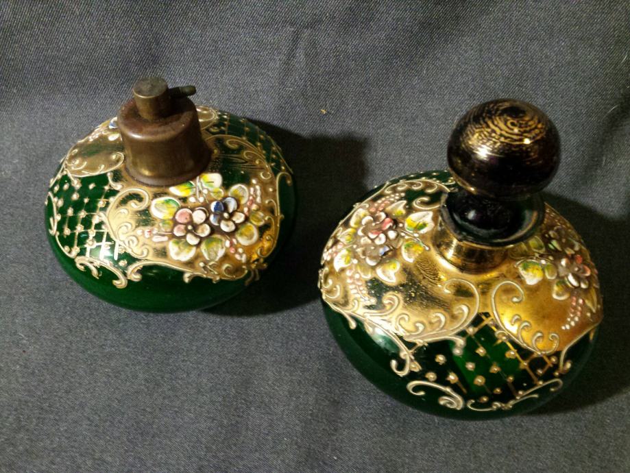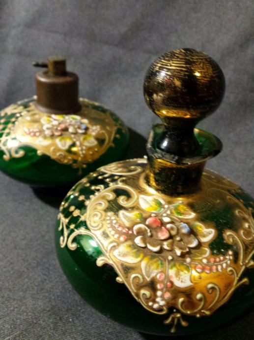Prodam 2 vintage steklenicki za parfum z zlato poslikavo. Ena ima nastavek za špricanje parfuma, druga pa zamasek. Slednja je na ustju odkrusena. Zelo lep izdelek. Unikat, rocno poslikano. V: 12 cm, premer: 11 cm