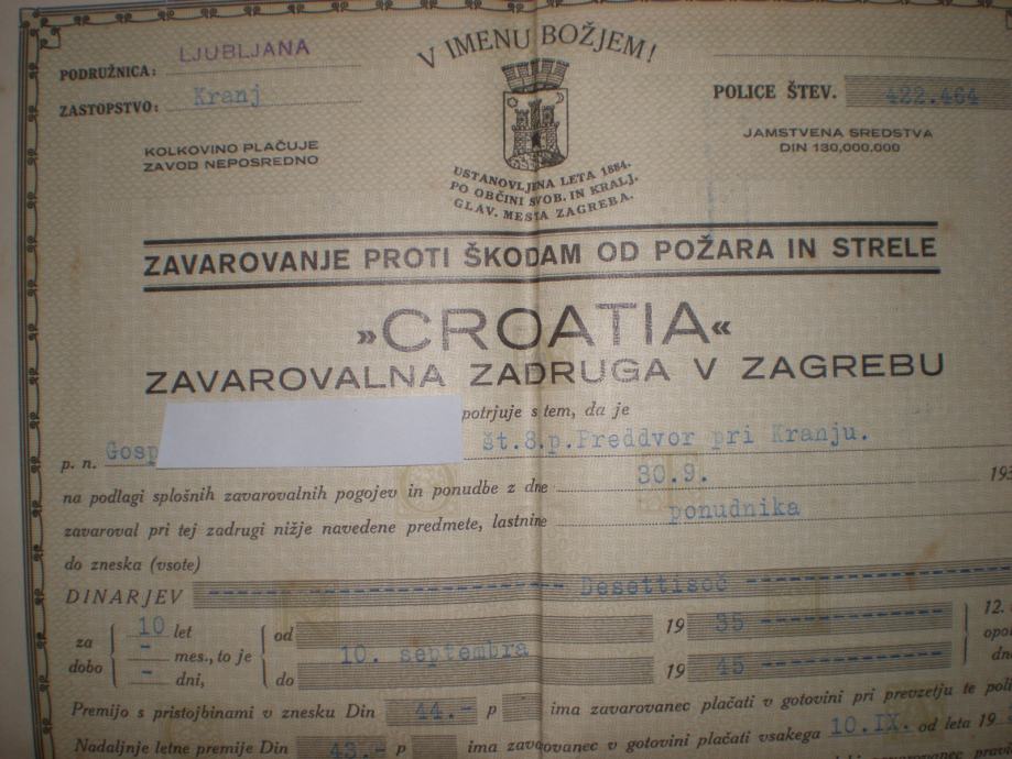 Prodam lepo ohranjeno zavarovalno polico iz leta 1935.