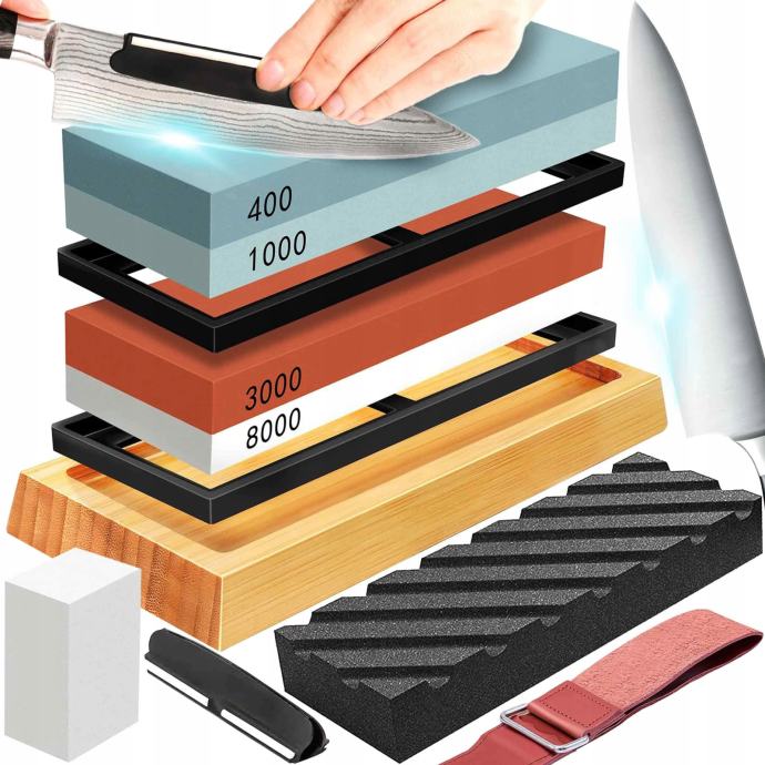 Vedno topi noži? Ne s tem kompletom. S štirimi različnimi granulacijami (od 400 do 8000) lahko hitro nabrusite ali spolirate rezilo do visokega sijaja. To orodje spremeni kuhanje in delo z ostrimi predmeti v užitek.