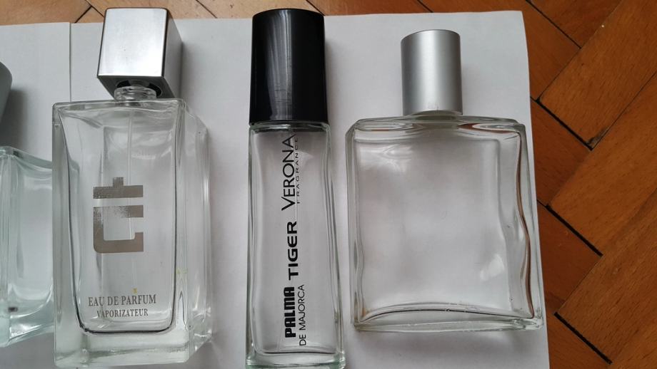 Prodam 10 (praznih !) stekleničk/flašk od raznih parfumov in vodic po britju. Vse so lepo ohranjene, počiščene/splaknjene in funkcionalne. Vsaka ima tudi še svoj pripadajoči pokrovček (8 – 13) ali sprej sistem (s cevko). Po starosti pa variirajo. Nekatere so tudi do 20 let stare. Uporabne so lahko kot zamenjava za polnitev nekih domačih parfumov ali pa tudi za kaj čisto popolnoma drugega. Skratka že čakajo na svoje nove lastnike. Cena v oglasu je za komplet, ker bi se le rad jih znebil v kompletu. Po komadu pa so okvirne cene za 1 – 2, 9 – 11 5 €/kos, 5 – 4 €, 4 & 6 – 3 €/kos in 12 ter 13 1 €/kos.