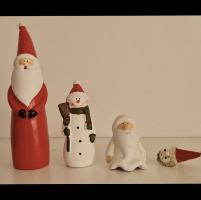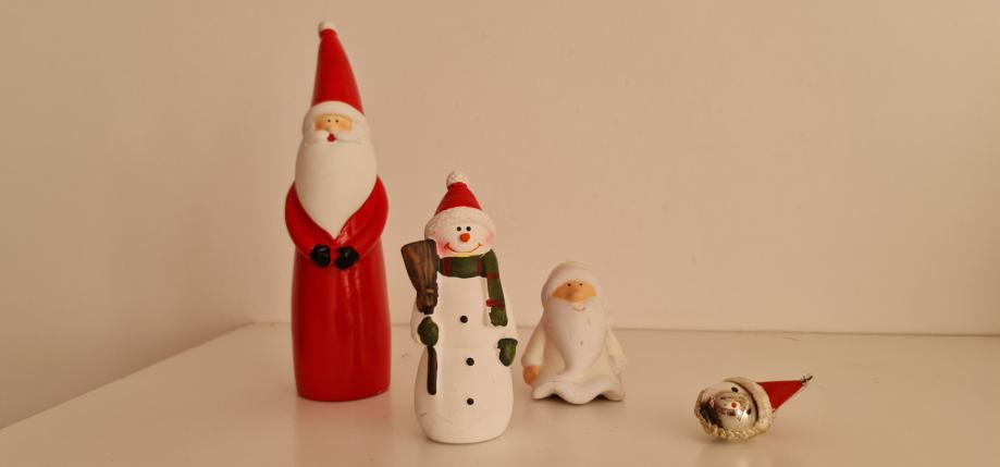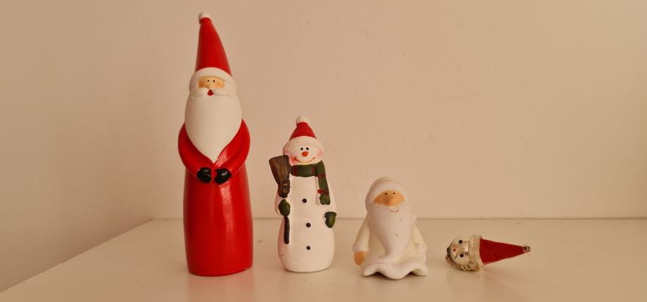 Komplet dekoracija za decembrske praznike. Tri večje figurce so nerabljene, zadnja najmanjsa rabljena.