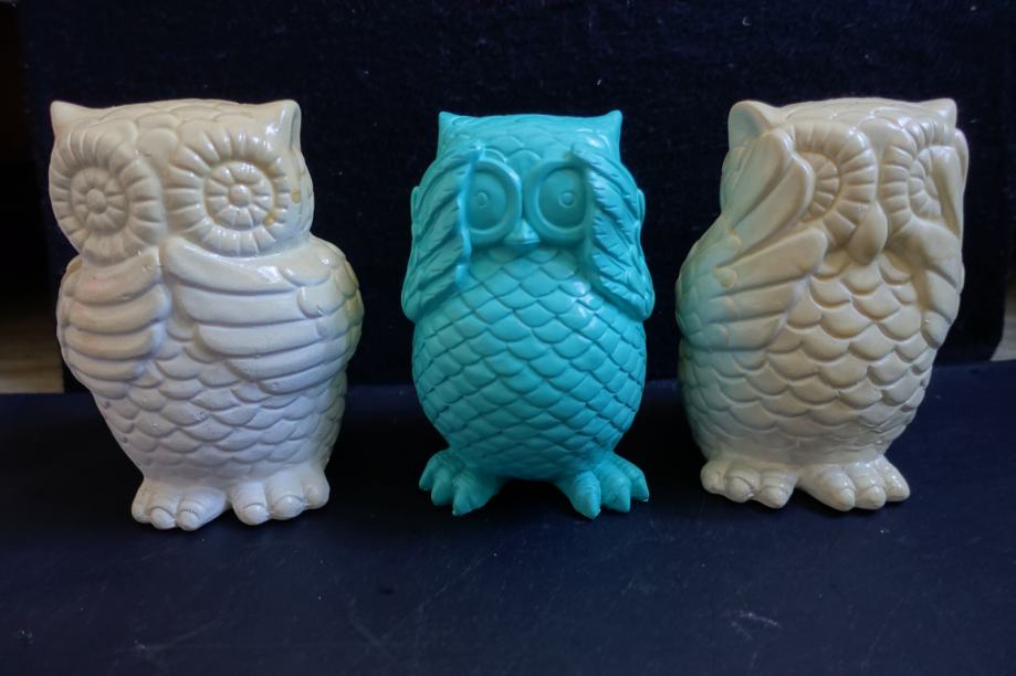 Zgornji del svetlih sov je rumenkast in glaziran, spodnji del pa mat bel. Razlikujeta se samo v tem, da si ena s perutničkami delno zakriva oči, material keramika.