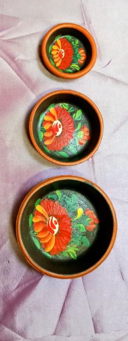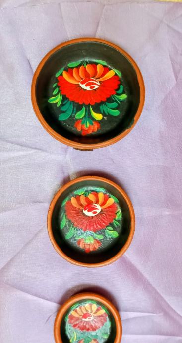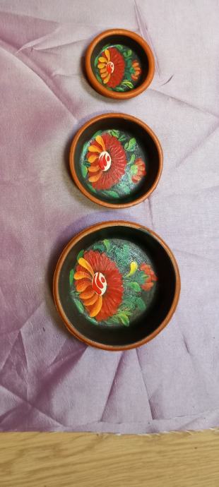 Prodajam komplet keramičnih krožničkov z ročno poslikavo cvetličnih motivov v živih barvah. Komplet vsebuje tri različno velike krožničke z oranžnimi cvetovi na zelenem ozadju. Krožnički so idealni za dekorativne namene, saj jih je mogoče obesiti na steno. Vel. premer največji 10, srednji 7,5 in najmanjši 5,5 cm. Lepo darilo, saj so brez napak. Tel. 031 679 411