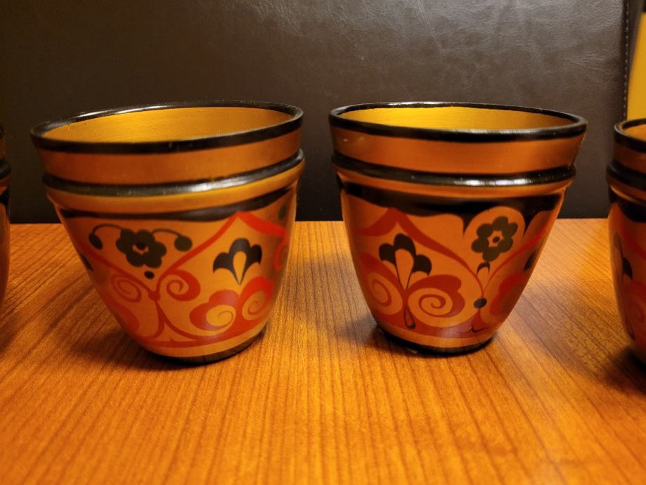 komplet lesenih ročno poslikanih sled, kroznikov, kozarcev, zlic