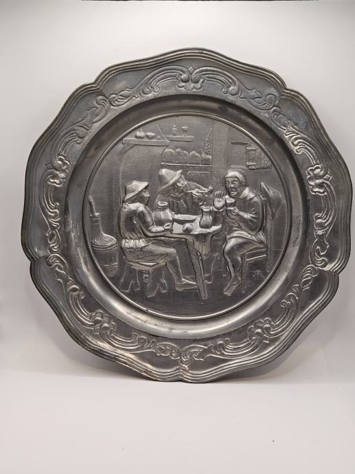 Prodam star okrasni krožnik iz kositra, reliefno okrašen z motivom treh mož za mizo v gostilniškem prizoru.