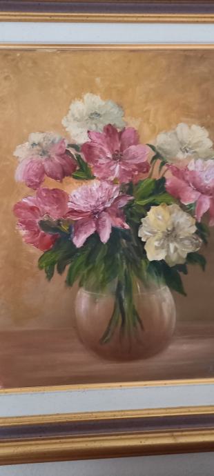 Prodajam novo oljno sliko tihožitja s cvetjem v vazi, delo avtorja Sitarja. Umetniška slika prikazuje čudovito kompozicijo roza in belih cvetov v stekleni vazi na topli zlatorjavi podlagi. Elegantno uokvirjeno platno bo dodalo pridih klasične elegance vašemu domu.