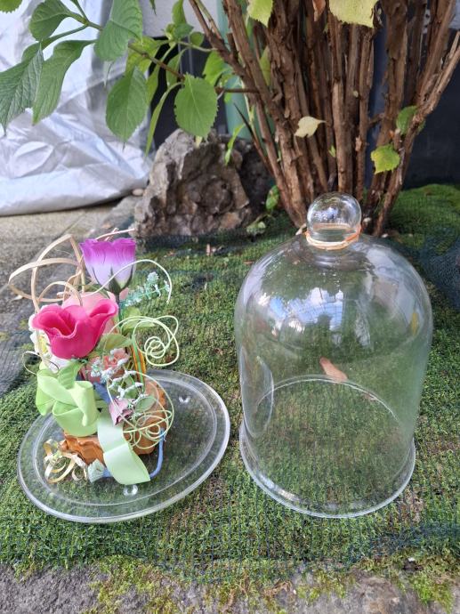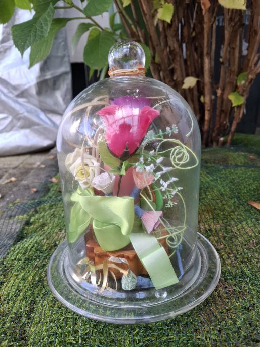 Prodajam čudovito stekleno dekoracijo z rožami, visoko 25 cm, ki bo elegantno popestrila vsak prostor. Stekleni zvon z dekorativnimi cvetovi in zelenim trakom je v rabljenem stanju, vendar še vedno estetsko privlačen. Idealna izbira za ljubitelje unikatnih dekorativnih izdelkov za dom.Pošljem po ceniku Pošte Slovenije.