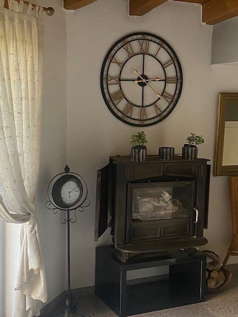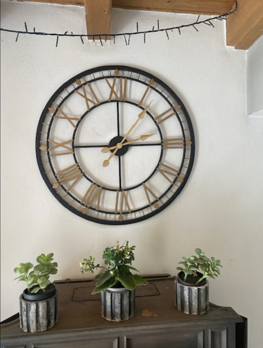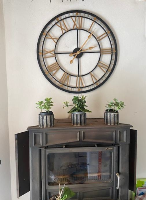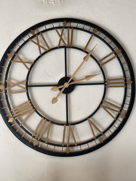 Retro ura iz pločevine crna z zlatimi številkami. Kupljena na Vivre.