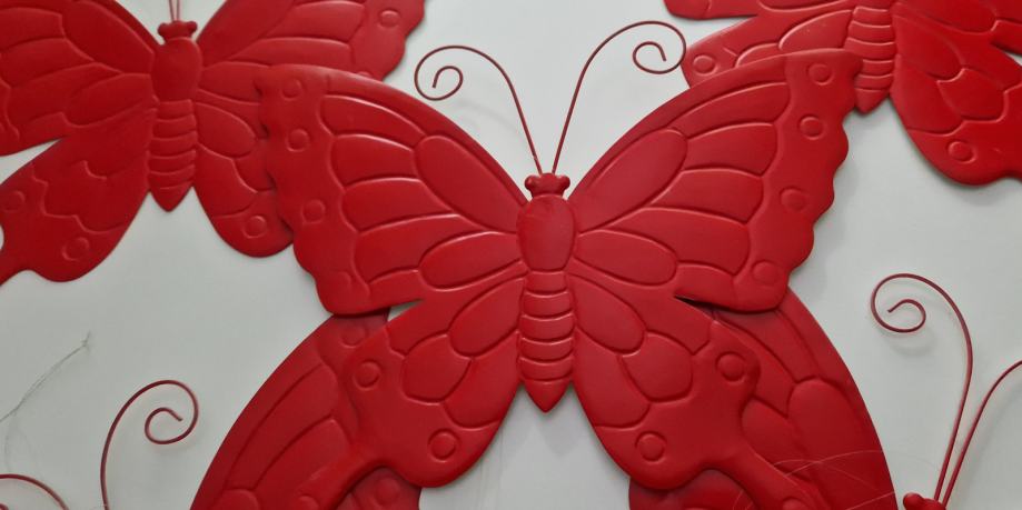 Prodam 5 čudovitih rdečih kovinskih metuljčkov za dekoracijo. Veliki so 35 x 40 cm. Prevzem v Ljubljani, lahko me pokličete na 064 222 903 ali mi pišete na tasi.zupancic@gmail.com.