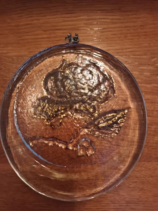 Okras za na steno - zlata vrtnica v steklu, premer 12 cm, prodam. Okras je brez poškodb, izgleda kot nov.