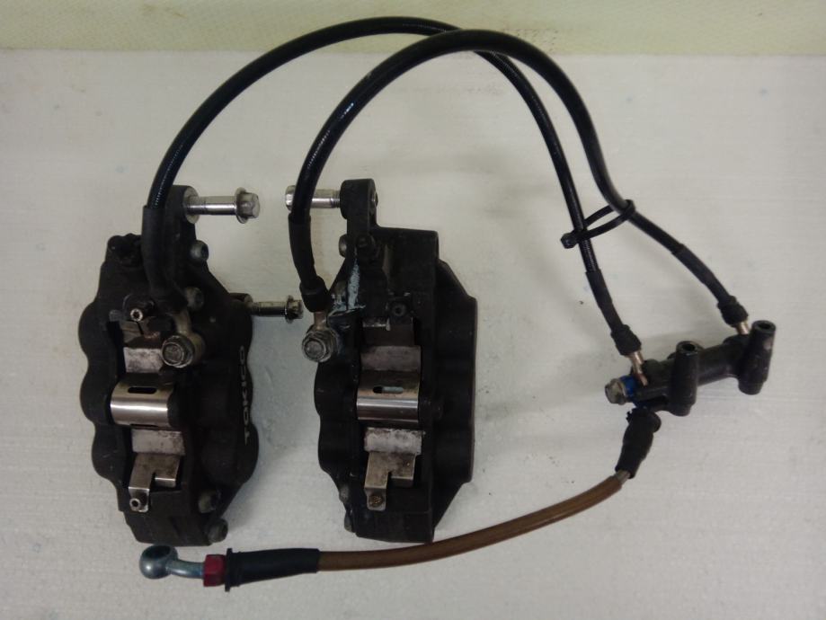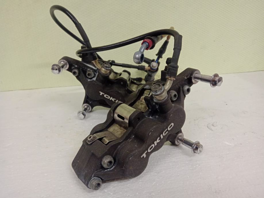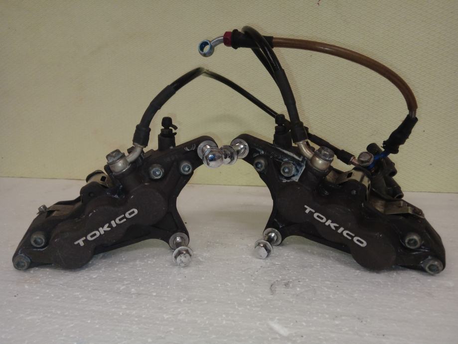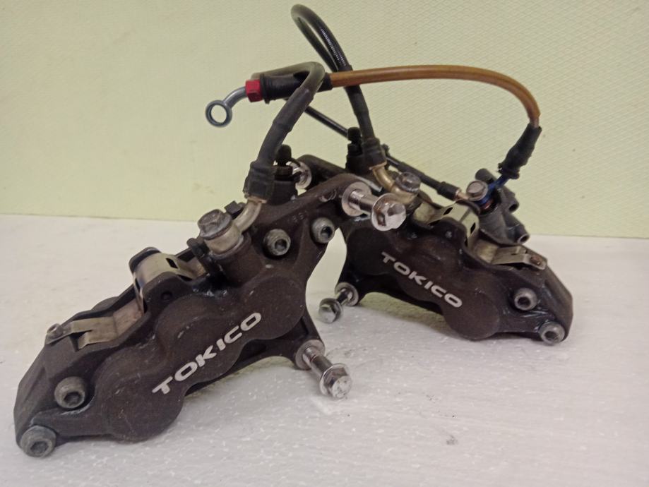 Original sprednje zavorne čeljusti Tokico komplet kot se vidi na sliki, skupaj s pleteneimi zavornimi cevmi od Kawasaki zx9r ninja model 1998-1999.